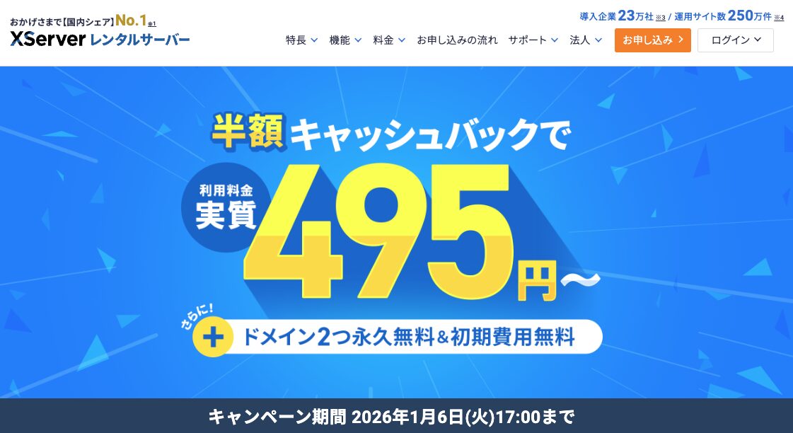 2026年1月6日(火)17:00まで『利用料金495円&ドメイン2つ永久無料&初期費用無料』になるお得なキャンペーン実施中です。